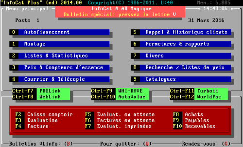 InfoCat Plus est un logiciel DOS permettant de faire vos ventes, achats, payables, recevables et votre comptabilité. Il était un précurseur lors de son arrivée sur le marché en 1986. Il est certainement un des logiciels étant resté le plus longtemps sur le marché et il continue de satisfaire une nombreuse clientèle.